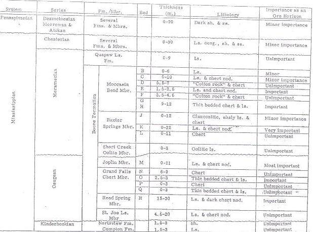 The Tri-State mining district was the leading zinc-mining district in the world for nearly half a century, and it was also an important producer of lead, silver, cadmium, germanium, and gallium (Hagni, 1986, p. 30). Mining of lead-zinc ended in 1970 with the closing of the Eagle-Picher Industries Swalley Mine near Baxter Springs and the closing of the Eagle-Picher central mill at Cardin, Oklahoma. Nearly all ore production of this district was from carbonate rocks of Mississippian age, with the most important production in the district coming from a zone called the "M" bed or the "Joplin member" of the "Boone formation". An informal system of zoning of the local rock units (Beds B through R) is commonly used in the Tri-State region that was developed by Fowler and Lyden (1932). This system along with local formal and informal stratigraphic units is shown in Figure 2, with the important ore "beds" emphasized on the zoning system by Hagni (1986, p. 31). For formal stratigraphic unit names in the area refer to Thompson (1986), Ebanks and others (1979), and Baars and Maples (1998).