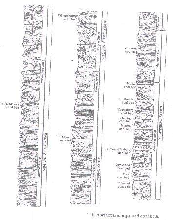 Figure 3. General Pennsylvanian stratigraphic column in Kansas showing coal beds that were extensively mined by underground mining in the state. (Click on image for larger version).