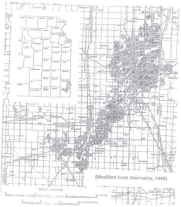 Figure 4. Area in southeast Kansas showing extensive underground mining for the WeirPittsburg coal (shaded area). Modified from Brady and others (1994) from original mine distribution by Abernathy (1944). (Click on image for larger version).