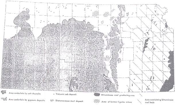 Figure 6. General distribution in Kansas of coal, lignite, salt, gypsum, volcanic ash, and diatomaceous marl. Modified from Hambleton and others (1961, p.12). (Click on image for larger version).