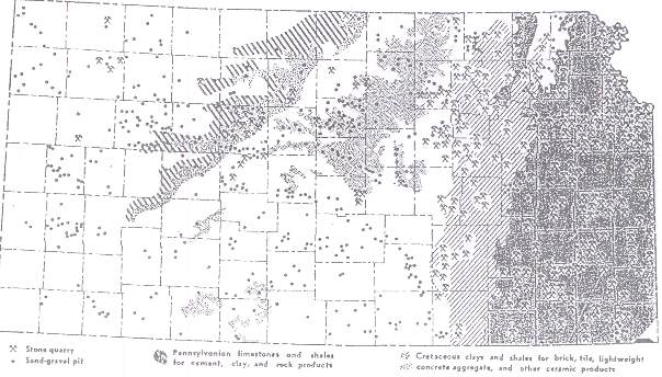 Figure 7. General distribution in Kansas of stone quarries and mines and sand-gravel pits. Modified from Hambleton and others (1961, p. 12). (Click on image for larger version).