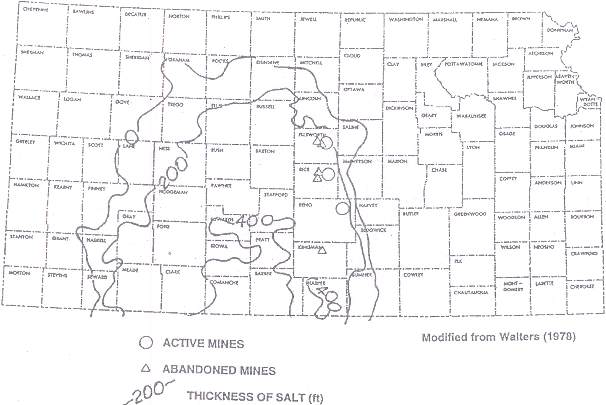 Extensive discussion of the Kansas salt deposits and salt mining methods are available in reports by Taft (1946), and Walters (1978). In the Walters report, emphasis is placed on land subsidence due to salt dissolution by improperly designed brine fields, and improperly plugged oil wells that penetrated the thick salt beds. Watney (1980) determined detailed distribution of the Hutchinson salt in Kansas.