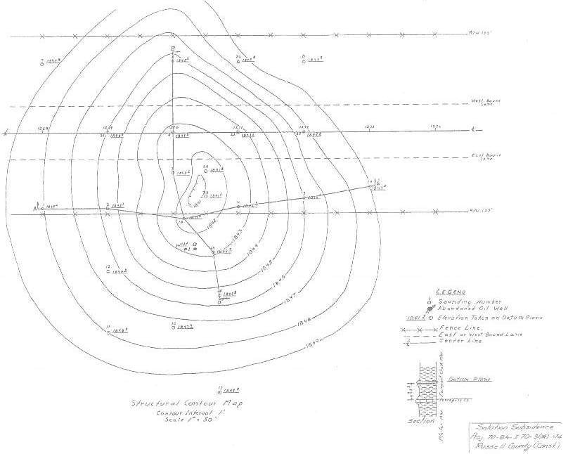 1-70 in this area is aligned through the heart of the Gorham Oil Field. It is a very densely-drilled portion of the state, and although sinkholes hadn't caused much trouble at the time, geologists quickly suspected that the subsidence was caused by improper plugging of abandoned wells. Research into oilfield geology and deep groundwater movement led the Highway Commission to the cause-dissolution of the Hutchinson Salt Member.
