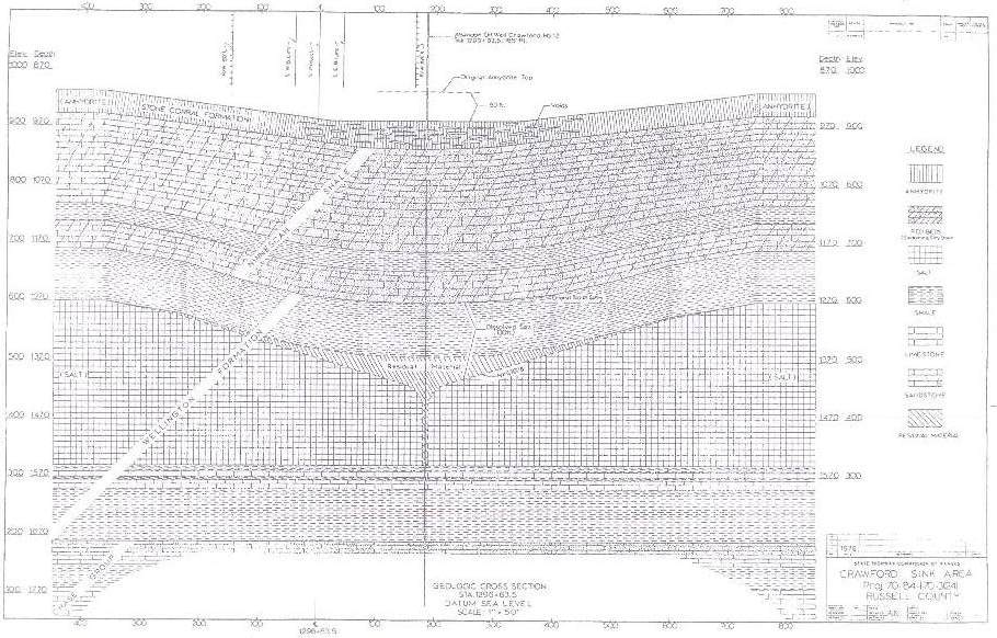 The next summer, the Highway Commission contracted with a drilling company to drill a deep exploratory well at the Crawford site. A crew with Rosencrantz-Bemis Drilling, of Great Bend, Kansas, drilled to 100 feet below the base of the Hutchinson Salt Member, a total of 1670 feet deep. Circulation was lost at 250 feet and never regained, which was attributed to washing of loose material at and below the Dakota Formation. Analysis of a radioactive gamma-ray neutron log indicated that the salt itself was washed along its entire thickness, and had been replaced by material from above. An anhydrite marker bed 350 feet above the salt had, at that time, already dropped 36 feet. Most importantly, however, was that very few voids were found, and none of these were large or near the surface. Officials told the public that the highway was safe, and that the sinkholes would cause only minor damage to the highway.