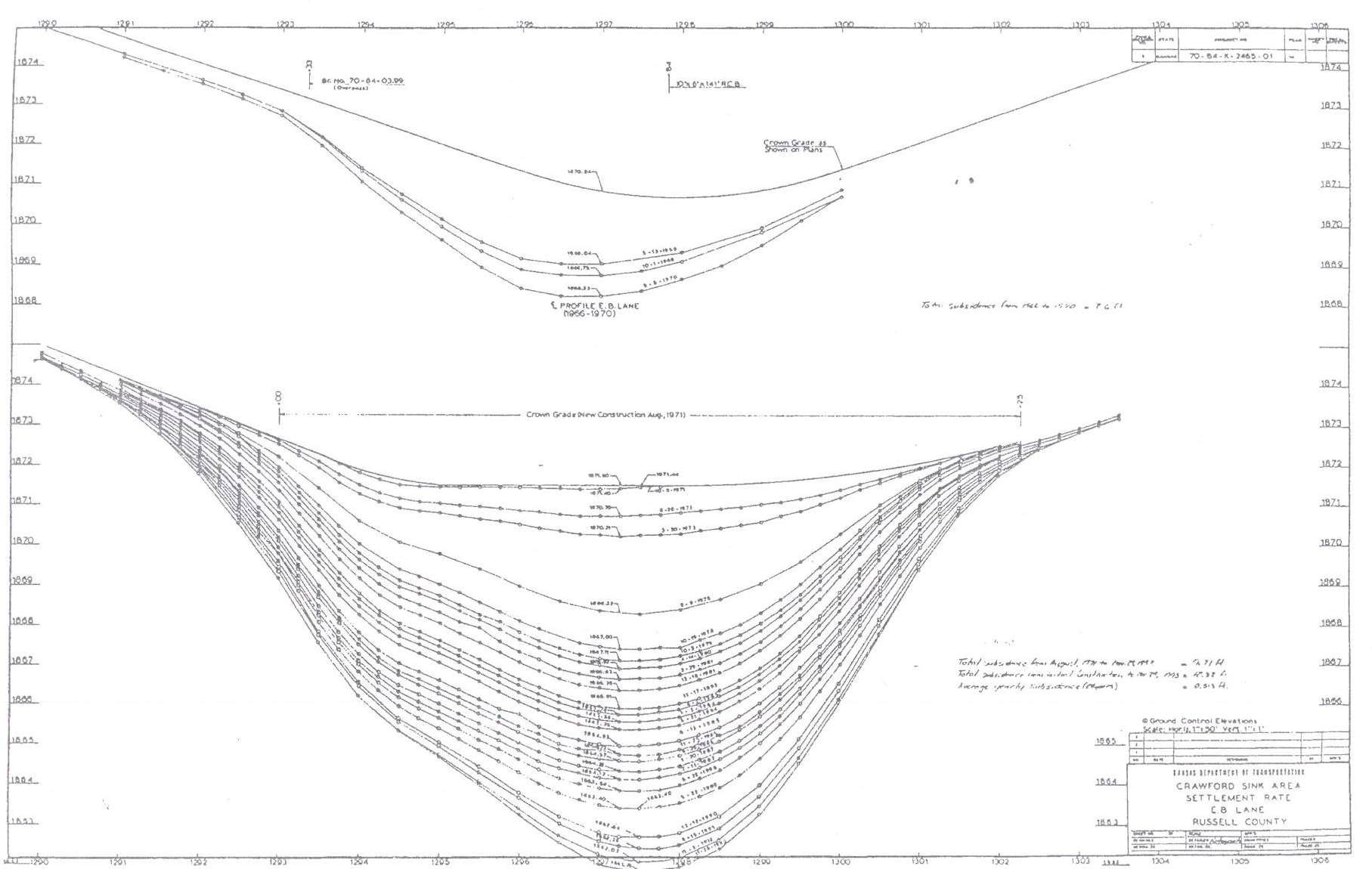 Figure 4: Profile of eastbound lanes of I-70 at the Crawford Sink. Upper graph shows settlement from 1966 to 1970. Lower graph covers from 1971, when lanes were regraded, to 1993. Total subsidence from the eastbound lanes during those 27 years was 12.3 feet. (Click on image for larger version)