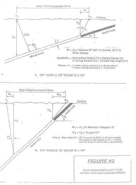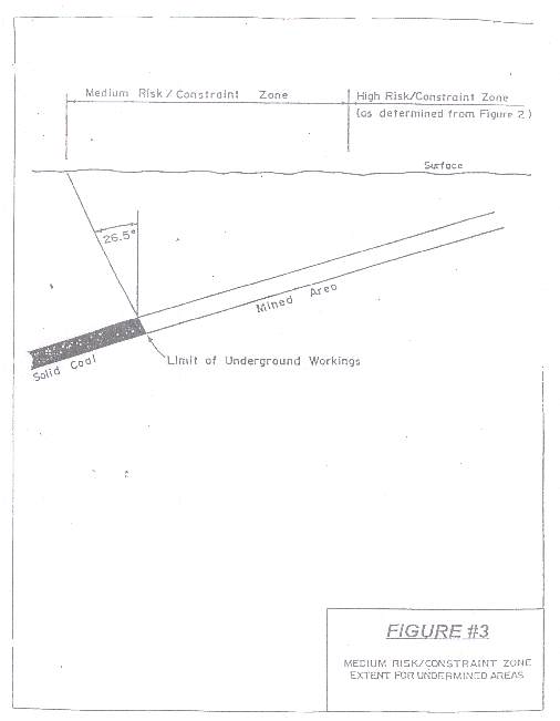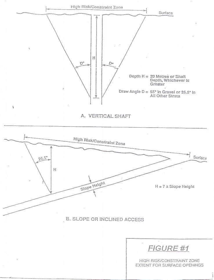 Unlike the abandoned mine programs in the United States, the Province of Alberta, Canada and the Town of Canmore regulates any activity being conducted in abandoned mine areas. Figure 1 is an exhibit from the Town of Canmore regulations that identify the criteria for determining the various constraint zones near surface openings. Figure 2 is a similar exhibit from the regulations where high constraint zones are determined above mine workings. Figure 3 identifies medium constraint zones above mined areas. Each of these exhibits is used as guidelines to issue building permits for new developments within the Town of Canmore.