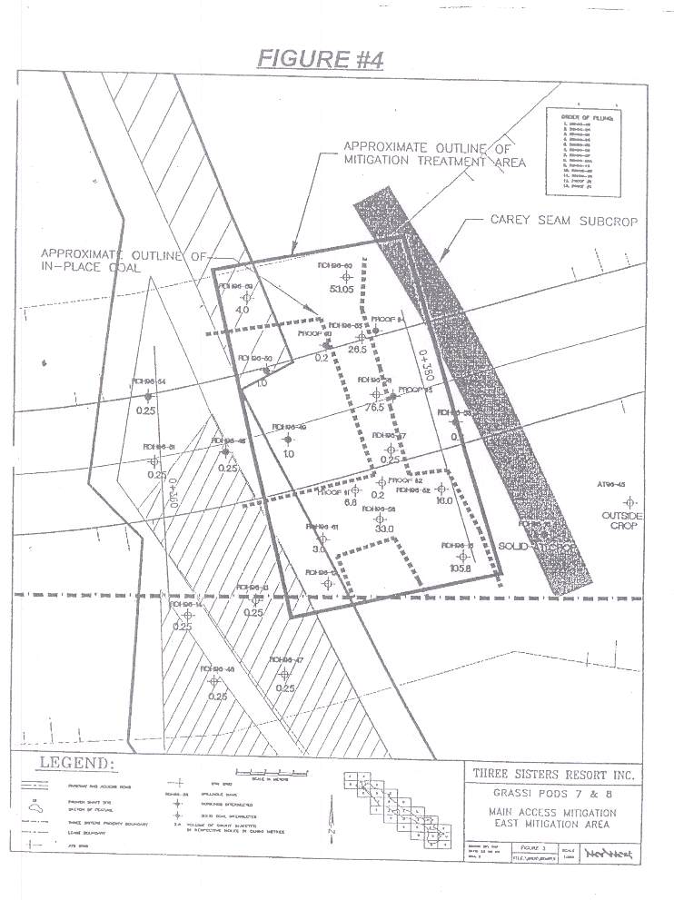 Three high priority areas were identified for Stabilization during the first phase of development. The first area was the main access roadway leading to the 375 home sites where it traversed the crop line and some relatively shallow workings. The dip in this area approached 55°, the void height was 9 feet (2.74 m) and the workings were within 20 feet (6.10 m) of the surface. Figure 4 is the as-built plan of the grout Stabilization that was completed along the main access road. 425 cubic yards (325 cu. Meters) of grout was injected into the void through 14 six inch boreholes. This volume of material exceeded the estimated volume by 22% which was a result of grout flow down dip. A down dip barrier of low slump concrete was installed to control the loss of grout but some bypass still occurred.