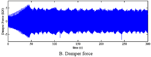 - The third pair of figures shows the RMS damper force measured in kilonewtons for the two installed devices as a function again of wind speed and direction. Clearly, the dampers are functioning and providing dissipative force to the stays as intended.