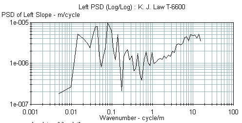 ANALYTICAL TECHNIQUES AND SOFTWARERoughness ProfilesThe roughness of a section of roadway can be expressed by the IRI, which indicates the average roughness for that road section. However, the roughness within this section of roadway can vary. For example, consider a 100-m- (328-ft-) long section of roadway that has a roughness of 1.23 m/km (6.5 ft/mi). This road section can be divided into 10 equidistant segments, where the length of each segment is 10 m (33 ft). Figure 8 shows the roughness of each of these 10-m (33-ft) segments. 1 m/km = 5.28 ft/mi Figure 8. Roughness of a roadway expressed in 10-m (33-ft) segments. 1Initially funded by FHWA, this software was developed by the University of Michigan‘s Transportation Research Institute. As shown in this figure, the roughness values for the 10-m (33-ft) segments are variable, with segment 1, which has an IRI of 1.42 m/km (7.5 ft/mi), having the highest roughness, and segment 9, which has an IRI of 1.01 m/km (5.3 ft/mi), having the lowest roughness. Instead of using a single value to characterize the roughness of a roadway, a roughness profile can be used to show how roughness varies with distance along the roadway. Figure 9 shows a roughness profile based on a 10-m (33-ft) base length for the same section of roadway whose roughness distribution was shown in figure 8. In figure 9, the roughness value for a specific location is the average roughness over a 10-m (33-ft) length (i.e., the base length of the roughness profile) that is centered at that location. For example, the roughness shown at a distance of 25 m (82 ft) is the average roughness from 20 to 30 m (66 to 98 ft). The highest roughness value in the roughness profile occurs at a distance of 50 m (164 ft), and, therefore, the 10-m (33-ft) stretch of the road that has the highest roughness is between 45 and 55 m (148 and 181 ft). A roughness profile can be constructed for any base length. A detailed description of roughness profiles is presented by Sayers.(20) 1 m = 3.28 ft. Figure 9. Example of a roughness profile. When evaluating the IRI repeatability of a profiler, or when comparing IRI values obtained by different profilers, an evaluation of roughness profiles provides much more information than just evaluating the IRI value that is obtained for the entire road section. For example, consider the following case where two repeat runs were conducted by a profiler (not LTPP‘s profiler) on a test section that was 180 m (590 ft) long. The left-wheelpath IRI values for the two runs were 1.66 and 1.63 m/km (105 and 103 inches/mi). The IRI values obtained for the two repeat runs were very similar, which seems to indicate that the profiler is capable of collecting repeatable data. Figure 10 shows the IRI values for the two runs reported at 10-m (33-ft) intervals. This figure shows that at some segments, there was a considerable difference between the IRI values obtained for the two runs. However, averaging IRI over the 152.4-m- (500-ft-) long section caused these variations to smooth out and gave an overall IRI value for the two repeat runs that was very similar to the individual value for each run. Figure 11 shows the roughness profiles for a 10-m (33-ft) base length for the two runs whose IRI values are shown in figure 10. As described previously, for the 180-m- (590-ft-) long section, the two runs have IRI values of 1.66 and 1.63 m/km (105 and 103 inches/mi). Although the IRI over the entire section is very similar for the two runs, figure 11 shows there are differences in the spatial distribution of the roughness for the two runs. The roughness profiles present much more information than what is presented in the bar charts shown in figure 10 because the roughness profiles show how the roughness captured by the two runs varies throughout the roadway. 1 m/km = 5.28 ft/mi Figure 10. IRI obtained from two repeat runs. 1 m = 3.28 ft Figure 11. Roughness profiles at 10-m (33-ft) base length for two runs. As illustrated in this example, it is important to recognize that, just because the IRI from repeat runs agree well, or the IRI from two devices agree well at a pavement section, it does not necessarily mean that the two devices are collecting similar profile data. Roughness profiles can be used to determine whether repeat runs from a profiler or profile runs from different devices are giving a similar spatial distribution of IRI along the section. Power Spectral Density PlotsA road profile encompasses a spectrum of sinusoidal wavelengths. A PSD function is a statistical representation of the importance of the various wavelengths contained in the profile.(2) The PSD function of the profile slope best shows the differences in the roughness properties because the basic spectrum of roughness over the wave numbers is more uniform.(2) In this research project, PSD plots that use the profile slope were used in the analyses. Figure 12 shows an example of a PSD plot of a road profile. This plot presents a view of the distribution of the wavelengths that are contained within the road profile. The x-axis of the PSD plot represents the wave number. The wave number is the inverse of the wavelength. If prominent wavelengths are present in a profile, such wavelengths will show up as dominant spikes in the PSD plot. 1 cycle/m = 0.3 cycle/ft Figure 12. Example of a PSD plot. Data FilteringThe profiles obtained by the T-6600 and ICC profilers have been filtered with a 100-m (328-ft) upper-wavelength cutoff filter, while the data obtained by the DNC 690 profilers have been filtered with a 91-m (300-ft) upper-wavelength cutoff filter. The profile data can be further filtered during data analysis to look at details within the profile. The types of filters that are commonly used in analyses are high-pass filters, low-pass filters, and band-pass filters. A high-pass filter removes wavelengths greater than a specified value. A low-pass filter removes wavelengths less than a specified value. A band-pass filt