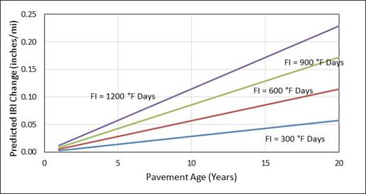 Figure 6 shows the increase in IRI predicted by the MEPDG model for flexible pavements due to the FI as a function of pavement age for four different FI values. As shown in figure 6, the impact of FI on the increase in IRI was negligible. For example, the increase in IRI after 20 years attributed to an average annual FI of 1,200 °F days was only 0.23 inches/mi, which was a negligible increase in IRI.