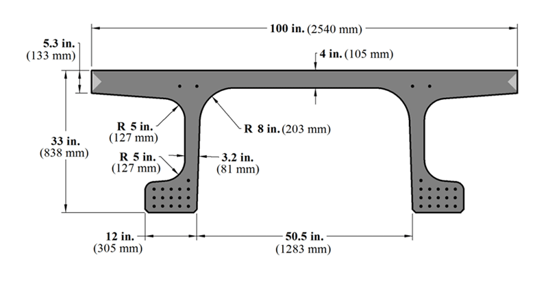 The St. Pierre La Cour bridge in France consists of 10 UHPC precast, prestressed concrete I-beams spaced at 55-inch (1.395-m) centers with a simple span length of 62.3 ft (19 m).(257) The deck consists of 1-inch (25-mm)-thick UHPC precast panels and an 8-inch (200-mm)-thick CIP deck.